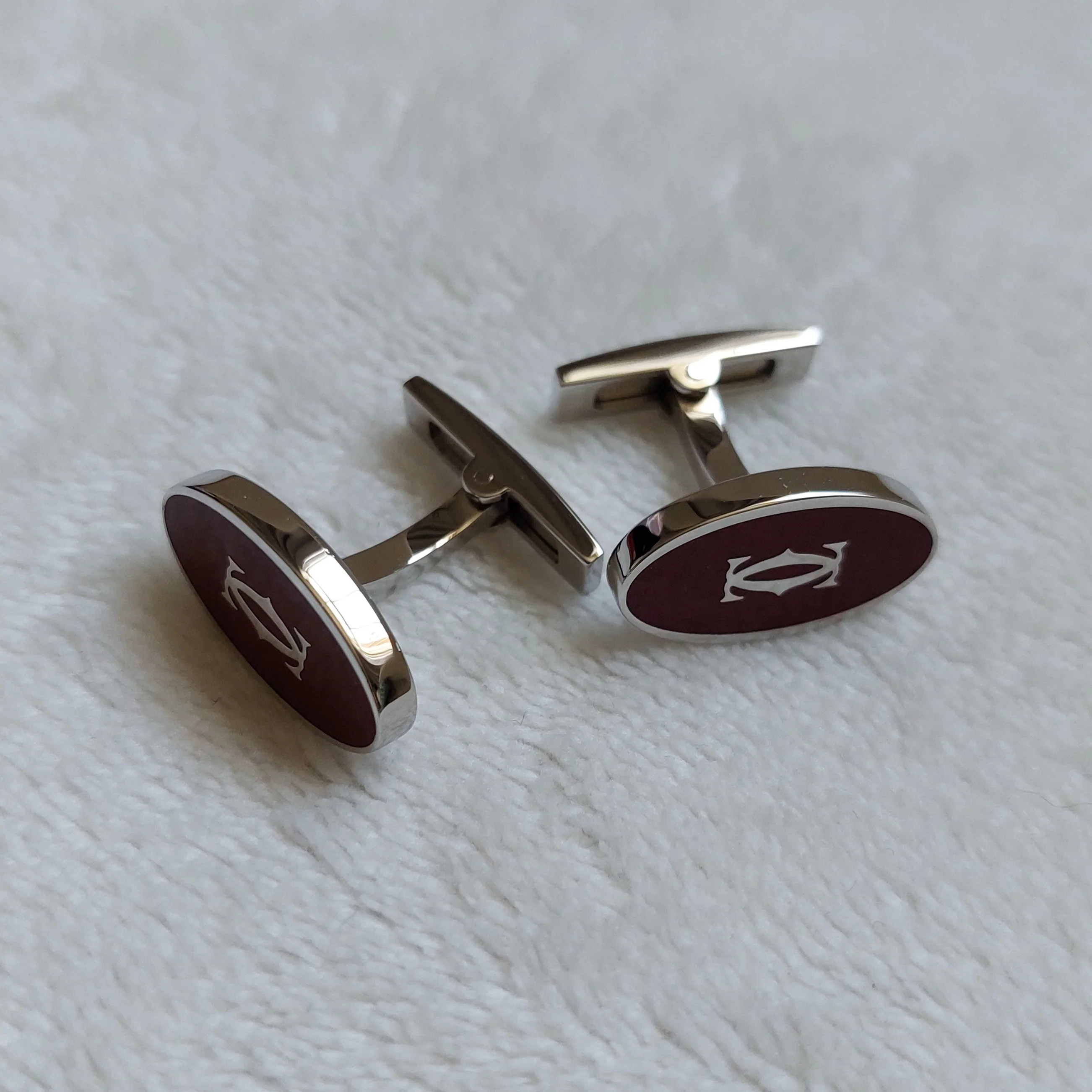 Elevate your formalwear with this refined pair of Cartier sterling silver cufflinks finished in palladium coating to provide a brighter and more durable surface finish. This timeless accessory showcasing the iconic double C motif set against a striking burgundy background in oval shape reflects understated luxury and impeccable craftsmanship. The torpedo back fittings ensure secure and comfortable wear whilst the presentation of these cufflinks in their original fitted Cartier box make an exceptional addition to any gentleman’s collection or a distinguished gift for a special occasion.
