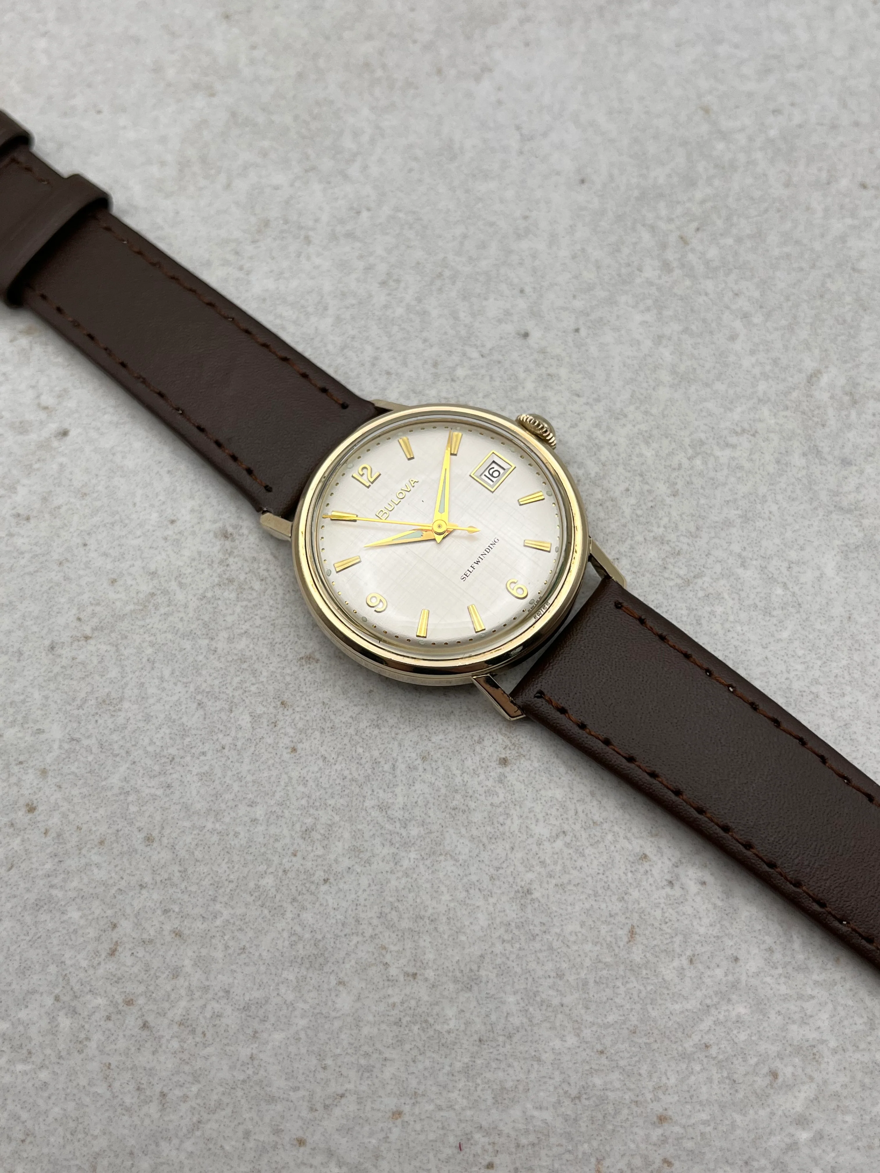 This is a stunning and rare vintage Bulova Self Winding which features a beautiful linen dial. The watch is in fantastic overall condition and shows just light signs of wear from its several decades of life. The watch is working perfectly and is keeping excellent time.Â