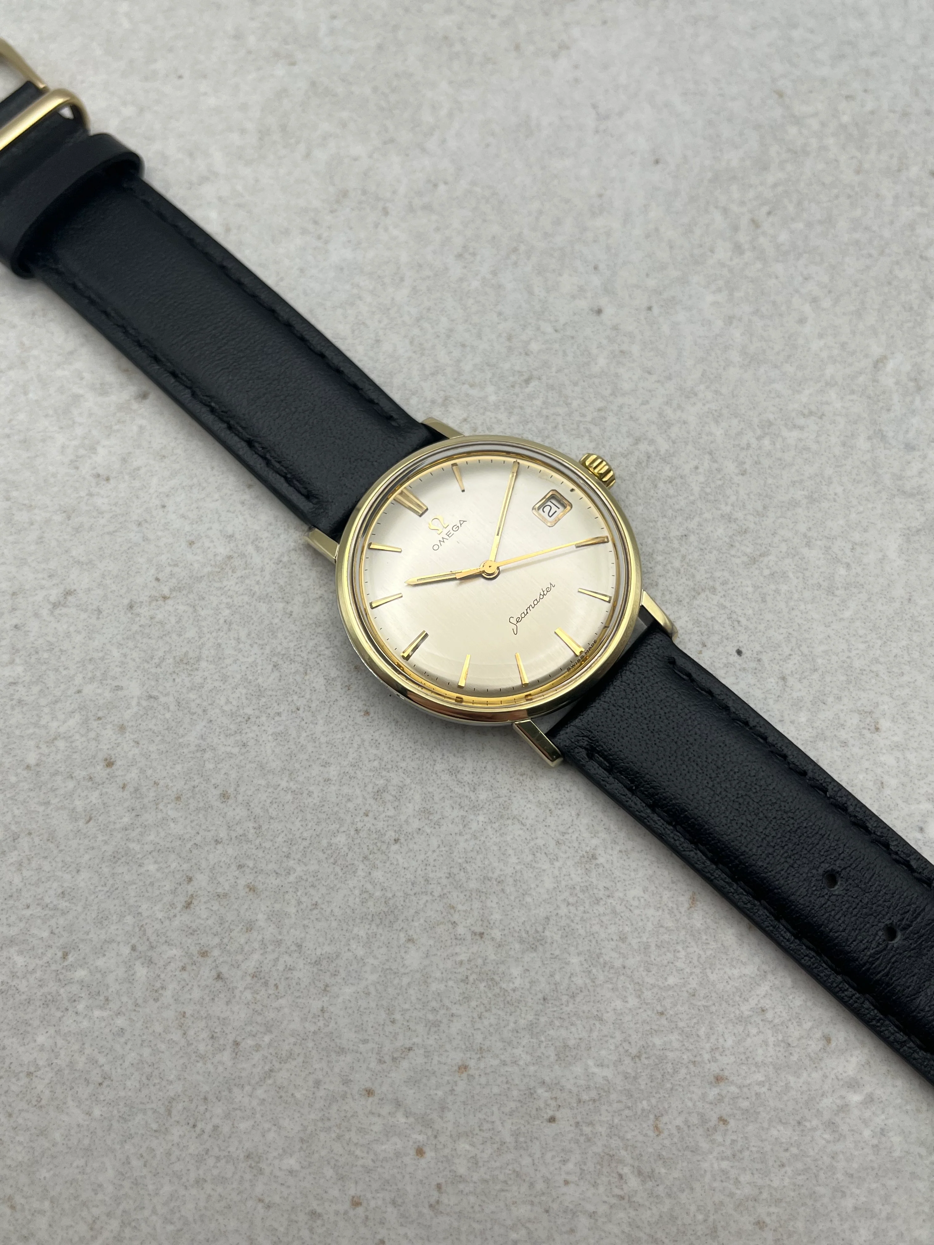 Here we present this spectacular two tone vintage Seamaster for sale which features brushed silver dial which displays some very very light patina which gives the watch a stunning look in the sun. The watch is in perfect working order and is keeping great time. We have just had this example fully overhauled and serviced.Â