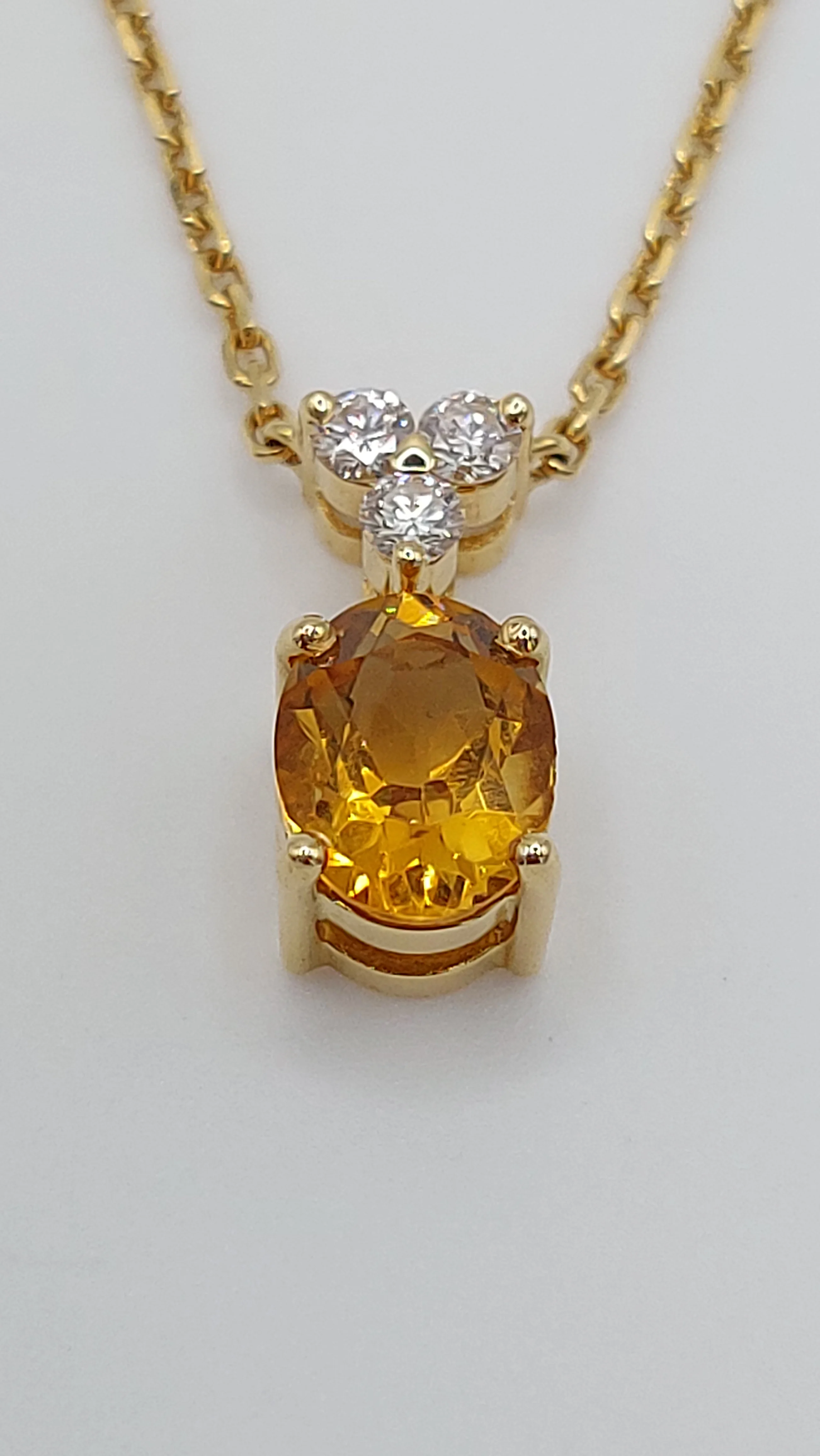 A stationary pendant necklace featuring a warm golden oval-cut Citrine at its focus, suspended in a fixed position on a fine chain so it always stays perfectly in place. The Citrine’s facets catch the light with rich honey-yellow tones, giving it a radiant, sunlit glow. Above the main stone, a set of three round brilliant-cut diamonds are arranged in a refined, balanced layout, to achieve the perfect shape. The combination of the vivid Citrine and the cool sparkle of the diamonds creates a harmonious contrast, making the piece elegant yet vibrant. The 18ct chain in yellow gold enhances the Citrine’s warmth and emphasizes the diamonds’ brilliance.