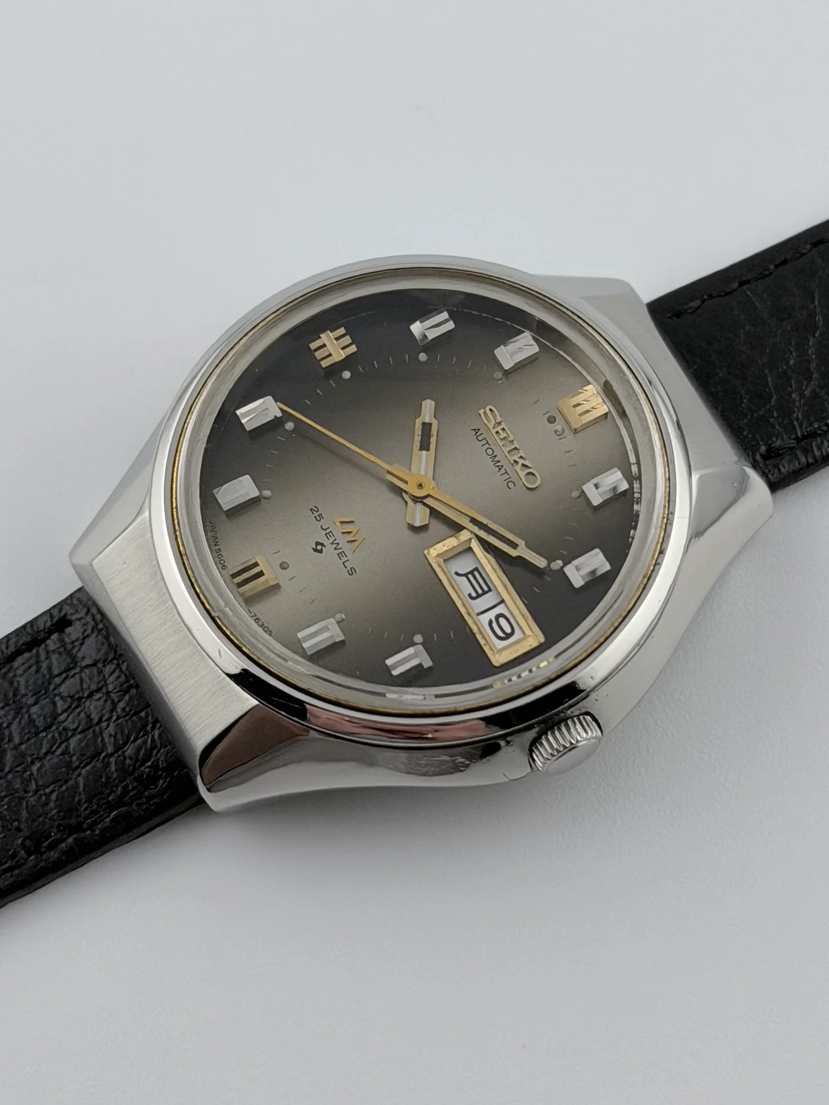 A striking vintage Seiko Lord Matic Automatic made in 1973 for the Japanes Domestic Market, featuring a rich, dark graduated dial that shifts subtly from light to deep brown depending on the light. The dial is accented by bold faceted hour markers in gold and silver tones, complemented by matching hands and a distinctive gold-framed day-date window displaying both Kanji and English. The interestingly shaped stainless steel case adds strong 1970s character, flowing seamlessly from the contour effects of the dial. Powered by a 25-jewel automatic movement, this piece offers classic Japanese craftsmanship, eye-catching wrist presence, and timeless vintage appeal. The watch is in excellent condition showing little signs of wear. It is also fully functional and keeping great time.