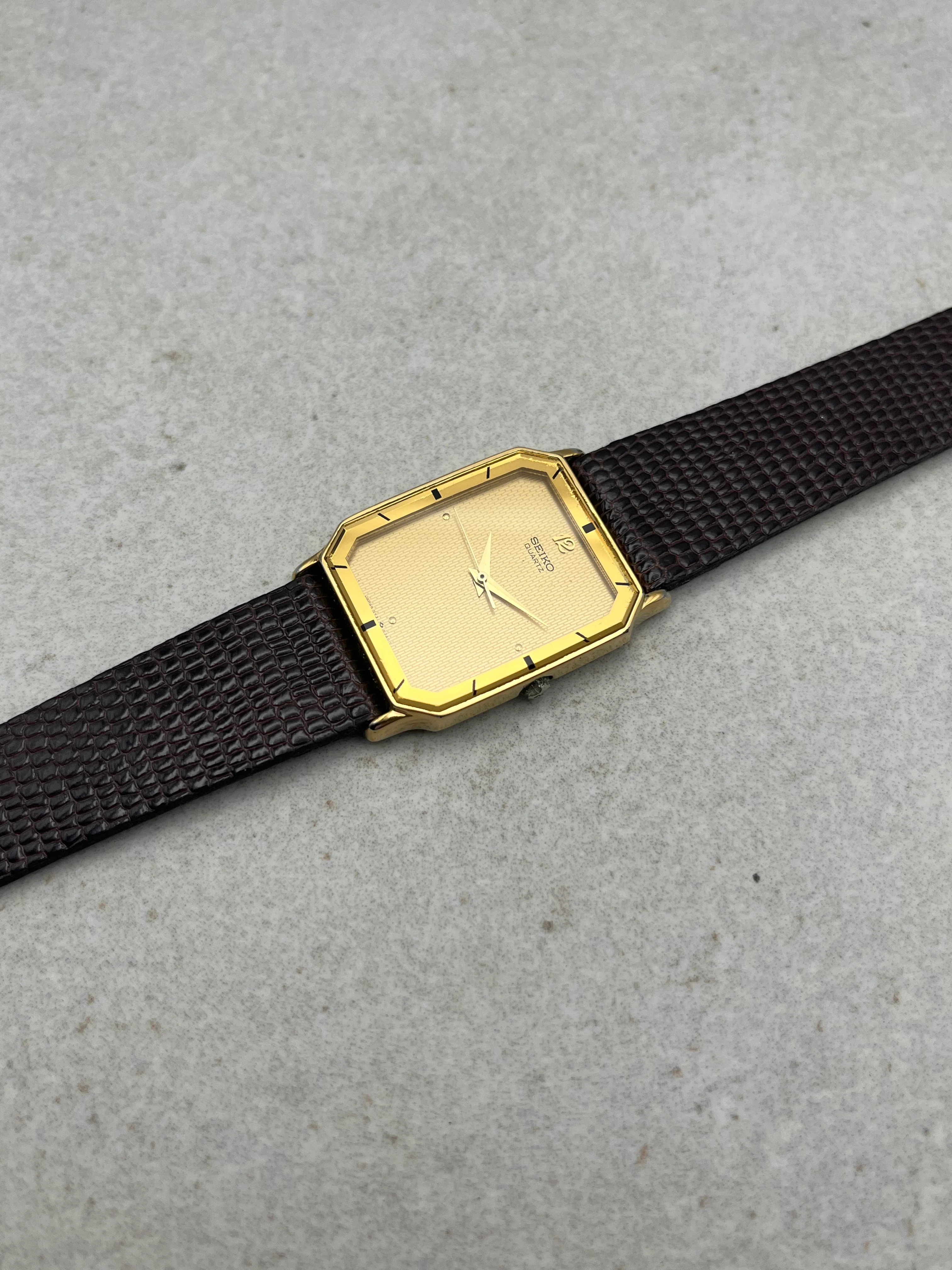 This is a lovely little vintage Seiko Tank which features a textured champagne dial and a fantastic gold inner bezel. The watch is in great condition, working perfectly and keeping time. The watch also comes with its original velvet box.Â