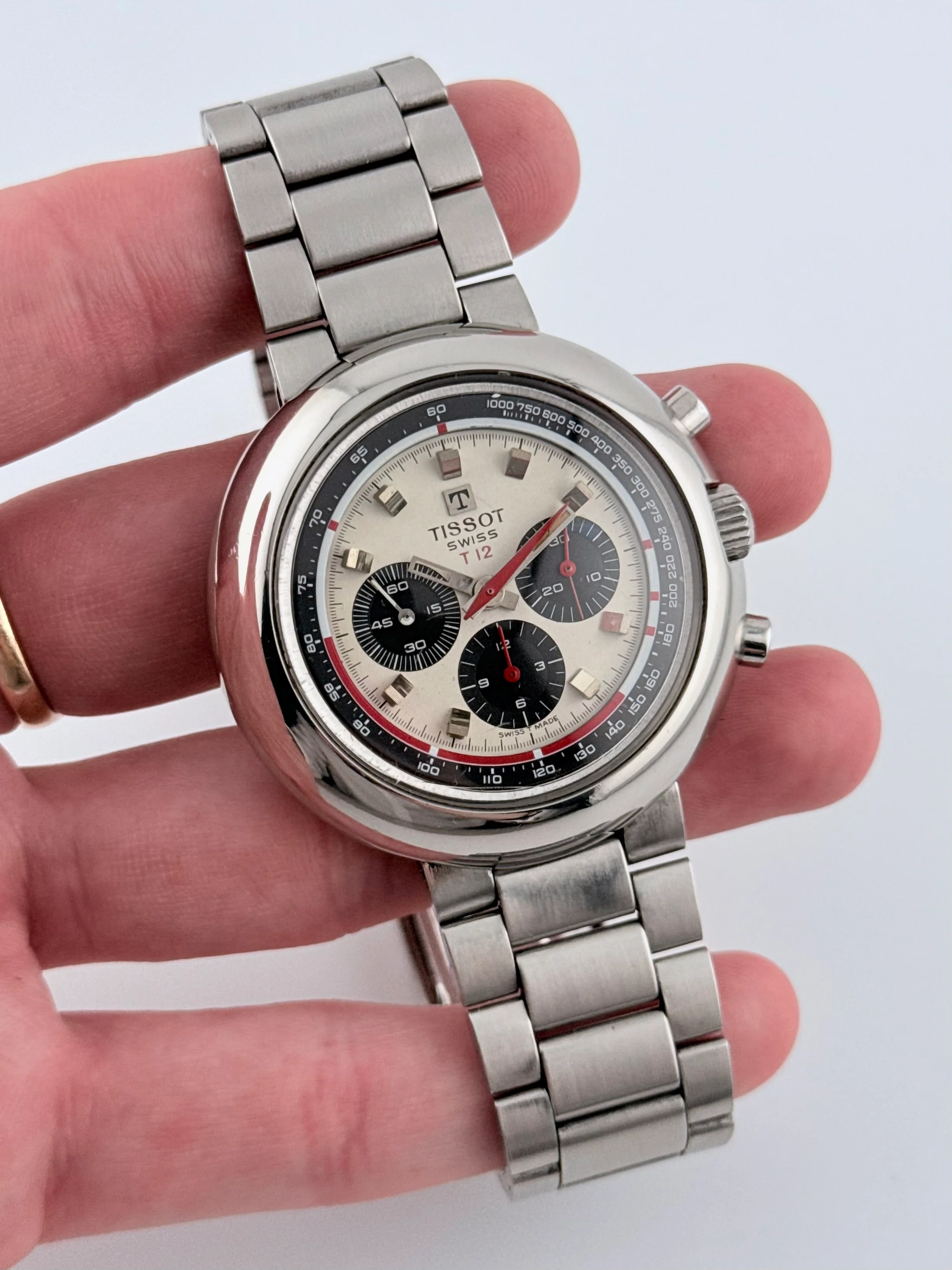 We present for sale this unique UFO style Chronograph from Tissot in the 1970s which is a design classic and still sits on its original Gay Freres bracelet. UFO style watches were a typical go to choice for the 1970s being chunky and very distinctive. The choice of colours for this dial are particularly impressive with a cream dial and black subdials complemented perfectly with the red hands used for the chronograph, 30 minute and hour dials. Even the wedge shaped hour markers look great on the watch. The movement is made by Lemania which was known for quality chronograph movements. The sub dials are all doing as they should with a seconds dial, 30 minute dial and an hour dial. The chronograph element starts and stops as it should and the re-set button is working correctly. If you are seeking something distinctive and different this watch will certainly start a conversation! The watch is in fantastic original condition and is working perfectly in all functions.